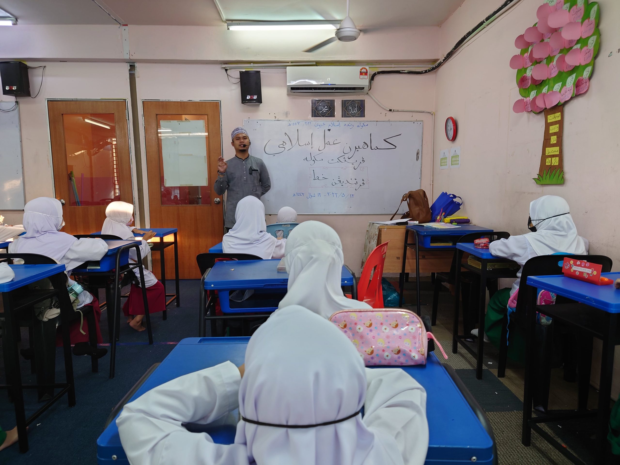 Pelajar bersiap ke Sekolah Kebangsaan untuk Tahap 1. Dan Pelajar Tahap 2 pulang dari Sekolah Kebangsaan bersiap untuk Kelas Mengaji & Fardhu-Ain.